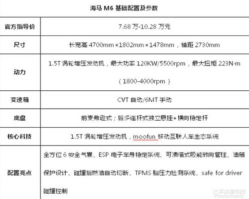 海马M6搭载的1.5T涡轮增压发动机由海马汽车自主研发,排气量1497ml,最大功率120KW/5500rpm,最大扭矩223N·m(1800-4000rpm),发动机在1000rpm时,即可启动涡轮,1800rpm时,达到最大扭矩峰值,大大优化动态性能及油耗,在城市路况中会有更好的表现。